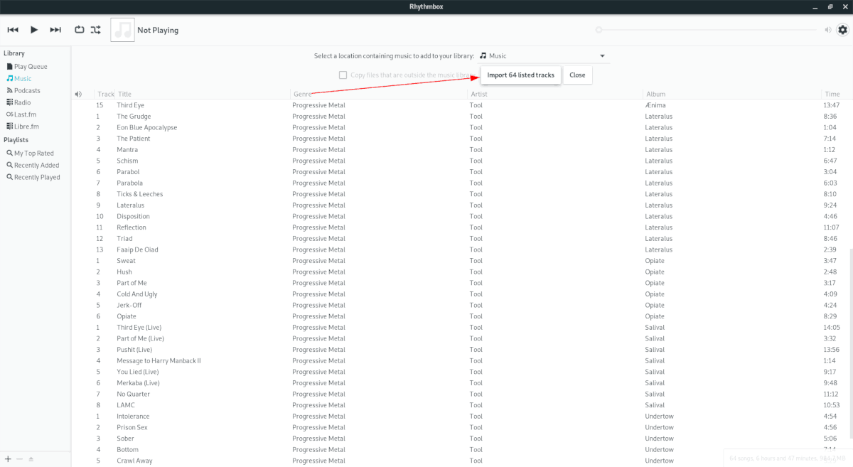 Step 4: Click the import tracks button to import discovered files into your Rhythmbox library.