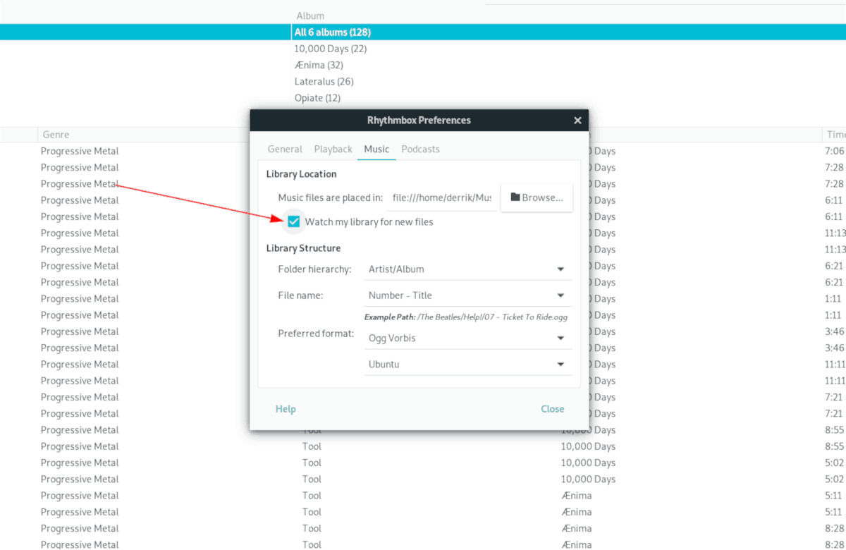 After selecting “Watch my library for new files,” Rhythmbox will be able to add new music files to your library automatically.