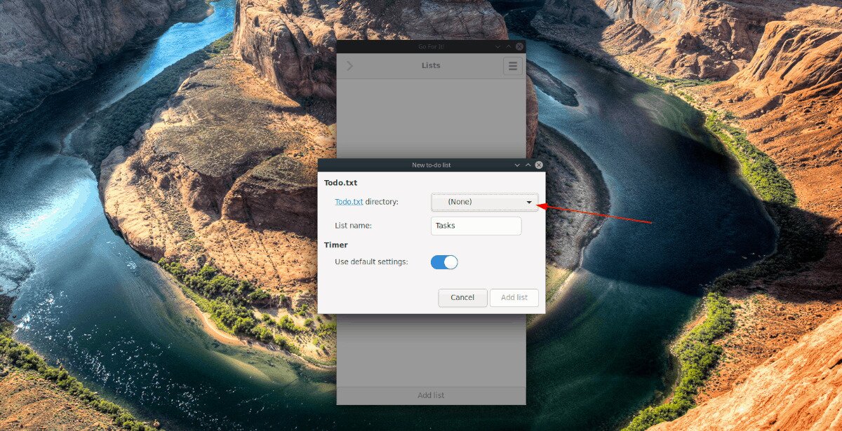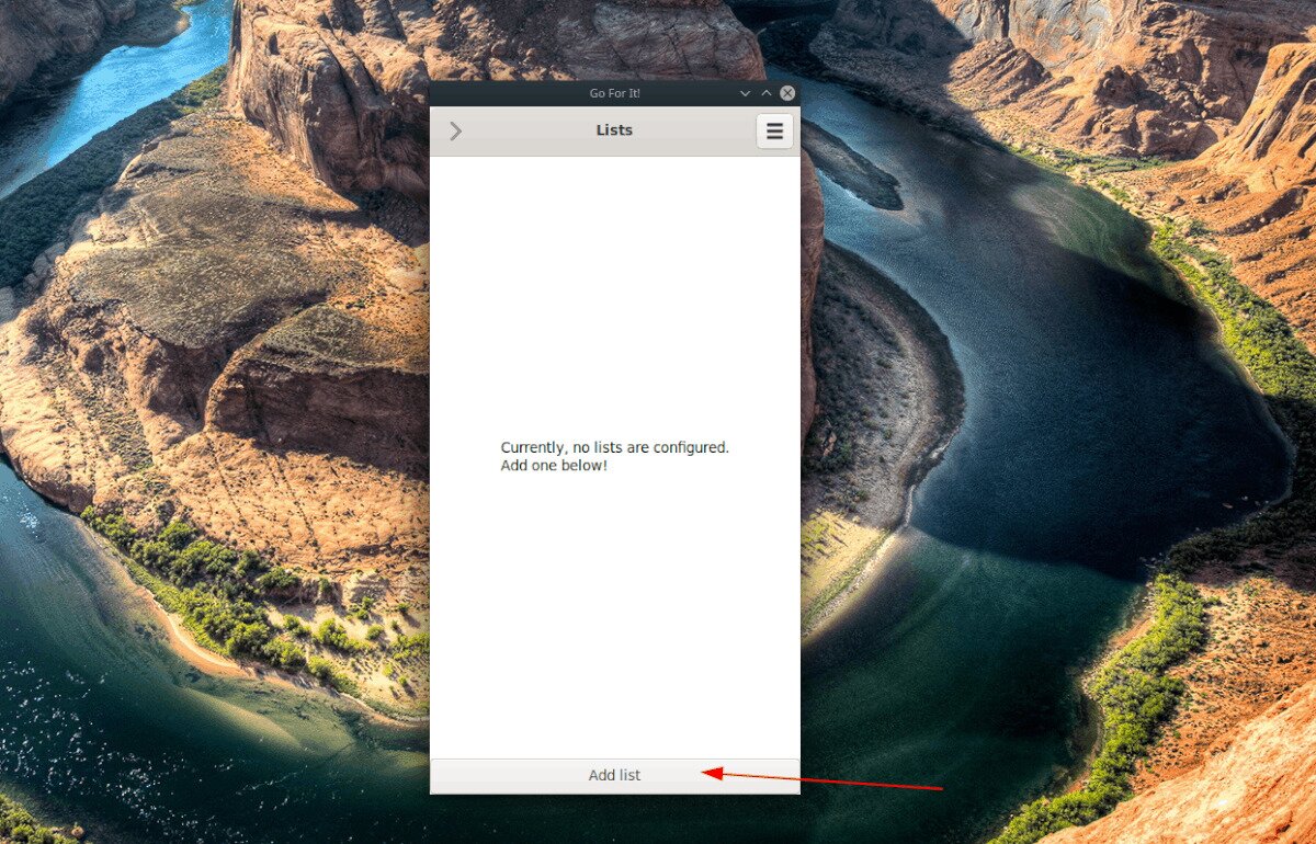 Step 1: Look for the “Add list” button at the bottom of the Go For It app, and click on it with the mouse. As you click it, you will see a pop-up window that says, “New to-do list.”