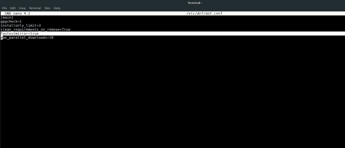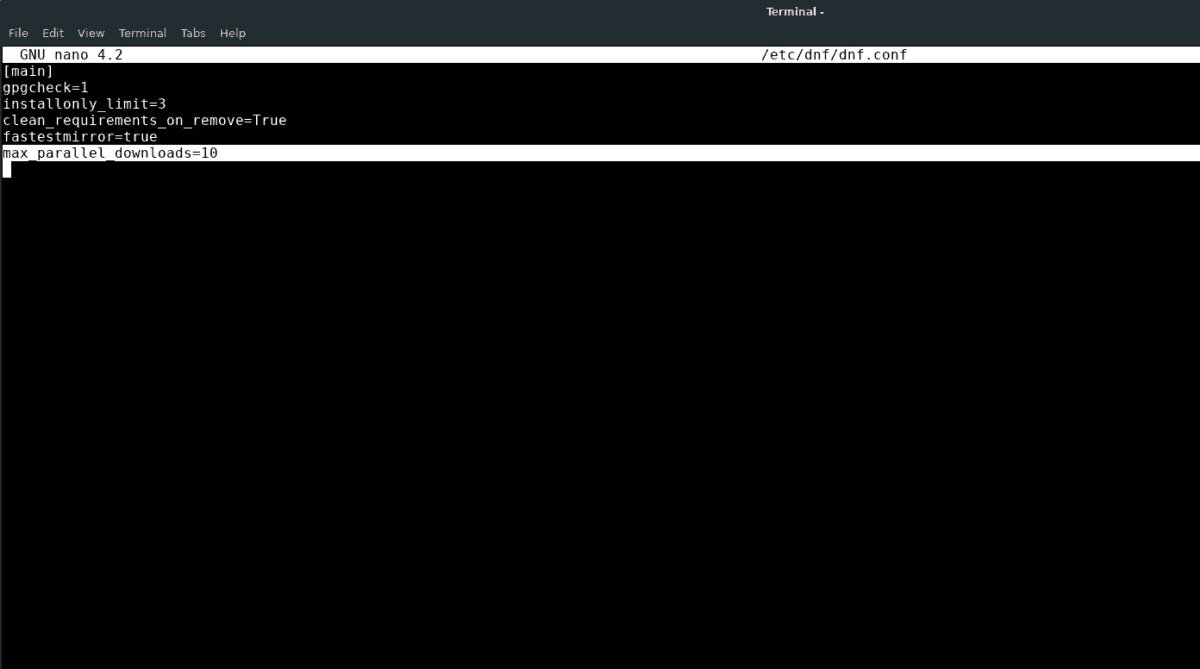To increase how many files the DNF package manager can download at a time, you’ll need to add “max_paralel_downloads” to the configuration file. To do this, return to the Nano text editor. Or, if you’ve closed it, re-open the file with the command below.