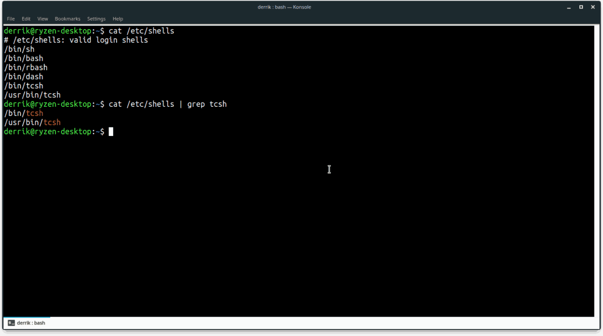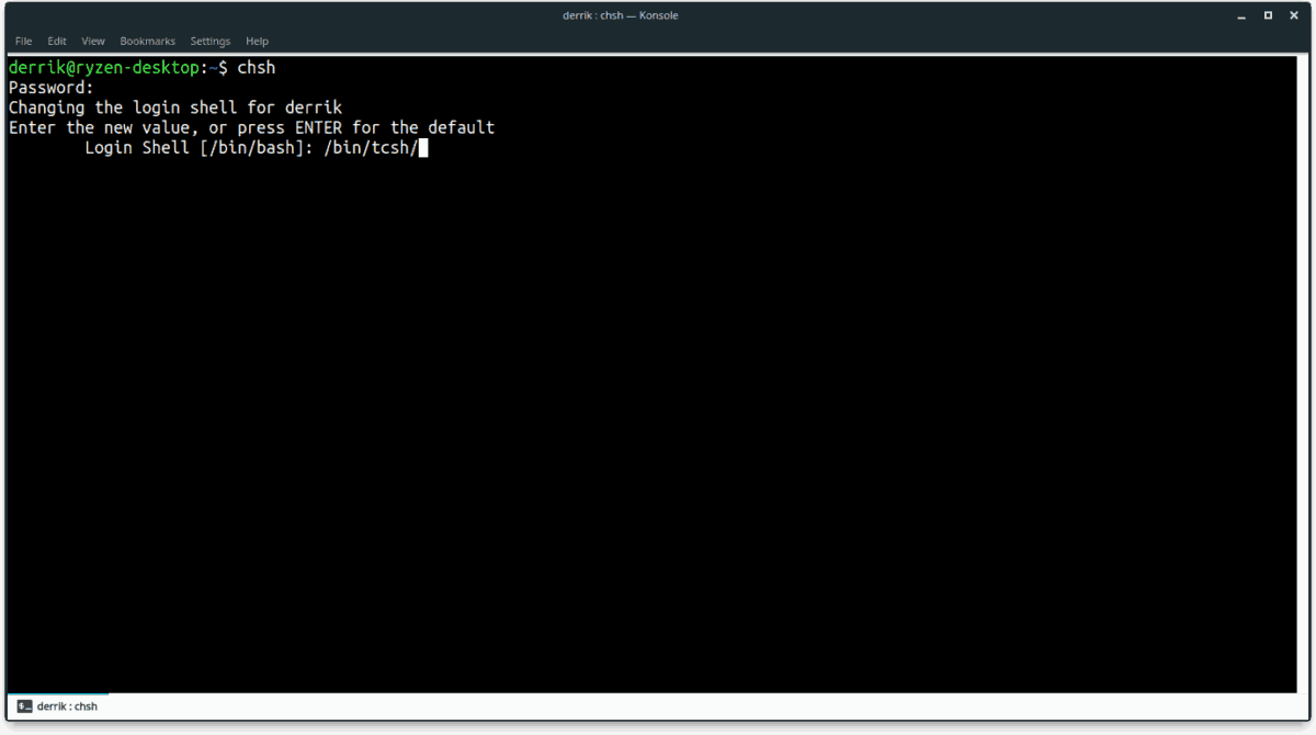 Entering the chsh command in a terminal will print out “Enter the new value, or press ENTER for the default” on the screen. At this point, you’ll need to specify the location of C Shell to set it as the default for your user. Take a look at the output of /etc/shells and write out where C Shell is in the prompt window.
