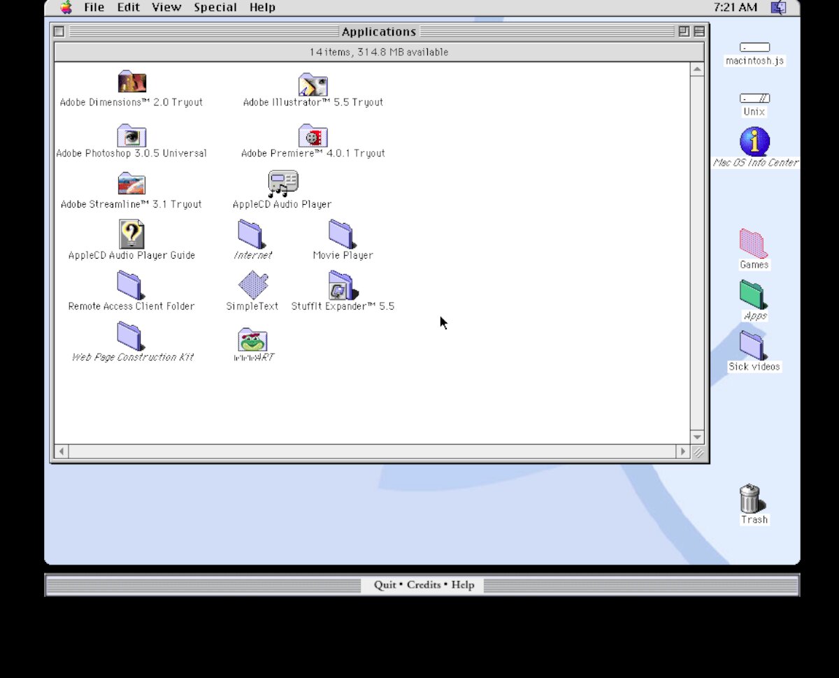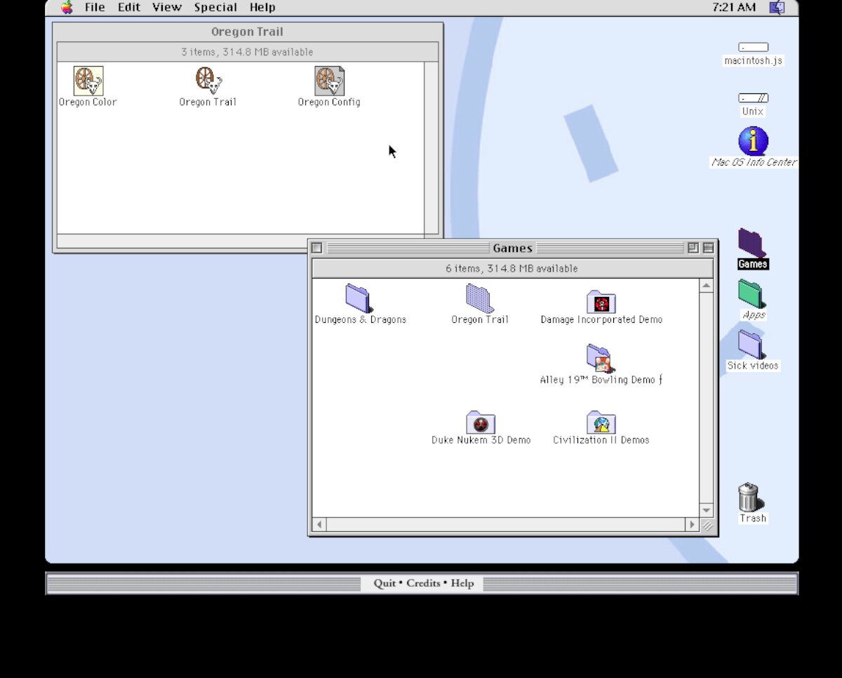 Macintosh.js is an Electron (web-based) virtual machine that allows the user to experience Mac OS 8 as if they had a real Mac OS computer. The VM comes with a wide variety of applications, games, and tools you can use out of nostalgia.