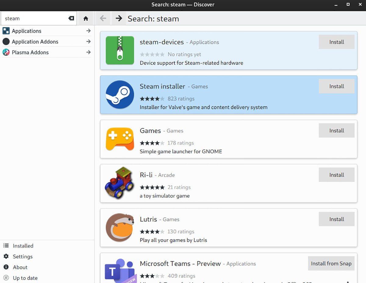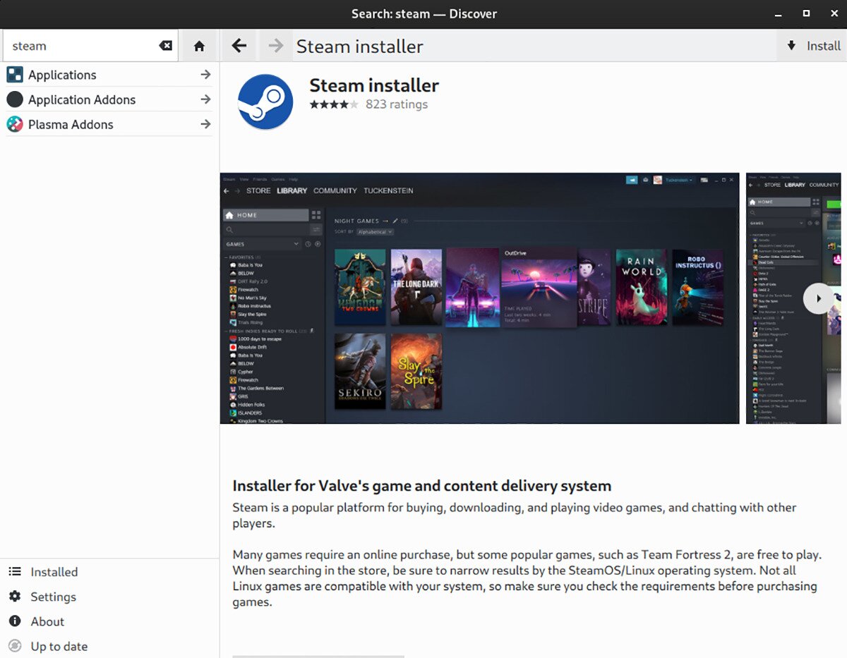 After clicking on Steam, KDE Discover will load up its app page. Then, click on the “Install” button to install Steam to your Linux computer.