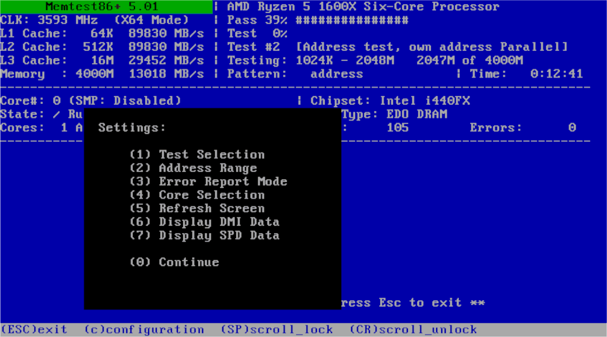 Step 2: In the C program menu, there are seven options. These options are “test Selection,” “Address Range,” “Error Report Mode,” “Core Selection,” “Refresh Screen,” “Display DMI Data,” and “Display SPD Data”.