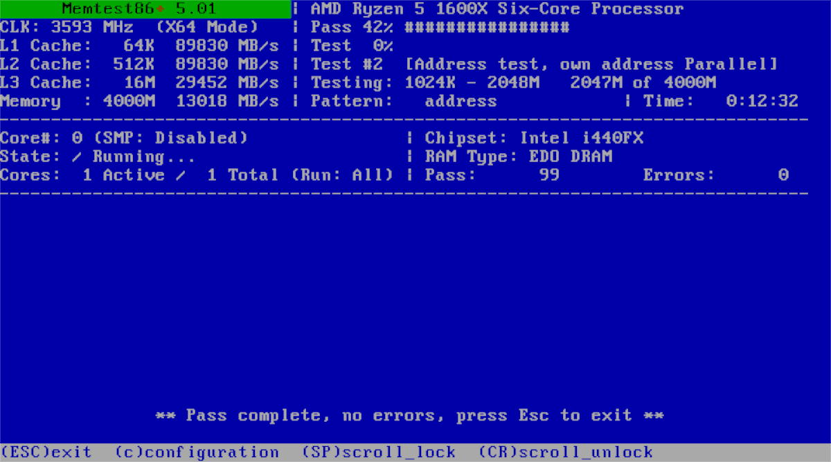 Then, once loaded up, the program will instantly start looking through your RAM to test it. Sit back and be patient for the tests to complete. When it is done, it will inform you if your RAM is working, or if errors were found at the bottom of the screen.