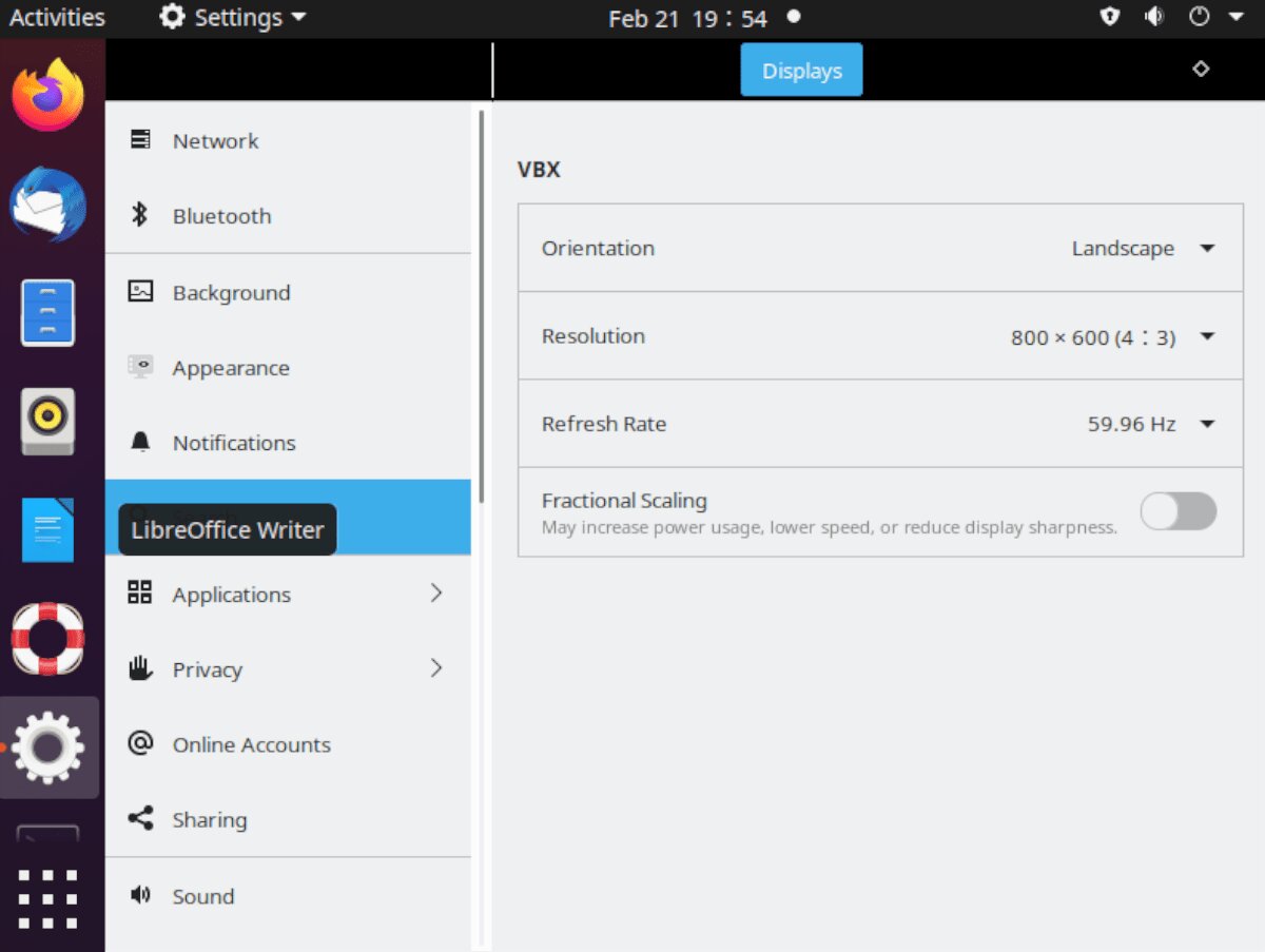 In the display settings for Gnome Shell, you’ll see an overview of the monitor you are currently using, as well as its orientation, refresh rate, and other things. Find the menu next to “Resolution” and click on it with the mouse.