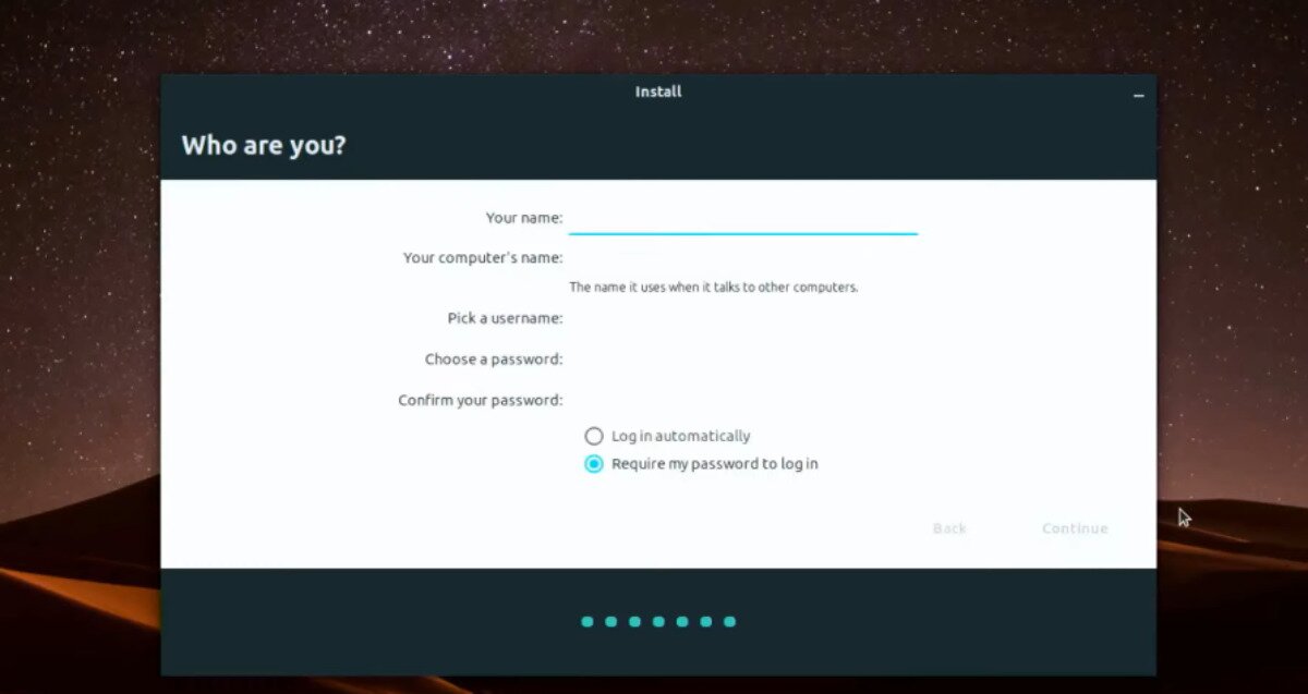 Followed by setting up your computer name, you must enter your user account name and your password. Using the two text boxes, enter your password and username. Click “Continue” to move to the next page.