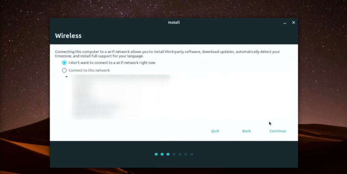 Step 3: If you have a WiFi chip inside of your desktop or laptop, Ubuntu Web Remix will ask you to connect to the internet. Using the installer UI, choose your WiFi connection, and connect to the network. Select “Continue” to move to the next page of the installer.
