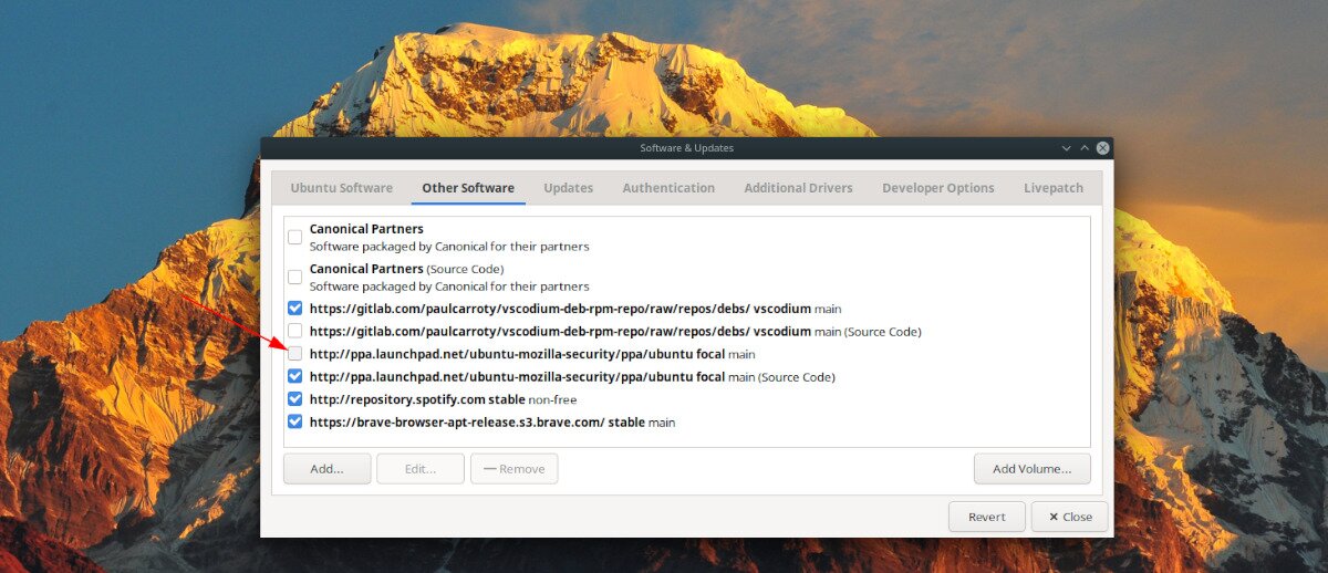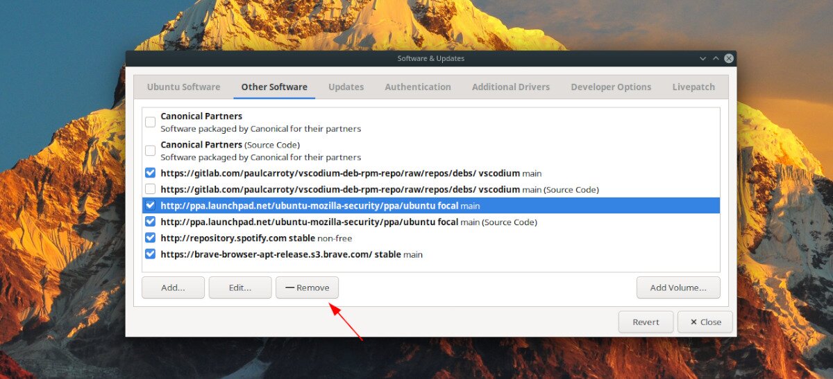To disable a non-working PPA forever, select it with the mouse. Then, click on the “Remove” button.