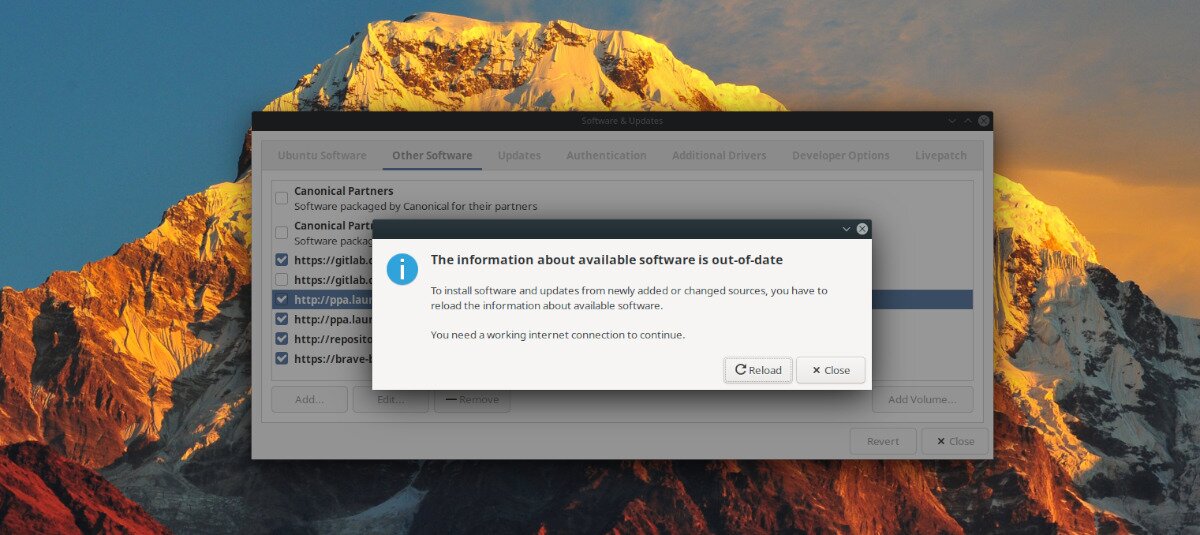 Step 6: When you click the “Close” button in the “Software & Updates” window, you will see a window telling you that your software sources are out of date. Click the “Reload” button to refresh them.