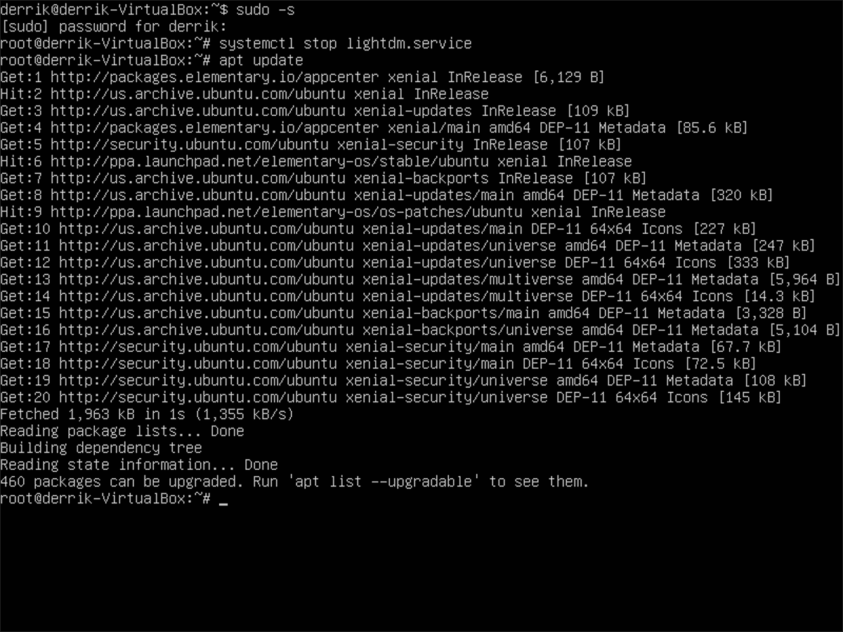 Step 4: LightDM is shut off. Now it’s time to install any pending updates to the current release we are on with the apt update and apt upgrade commands.