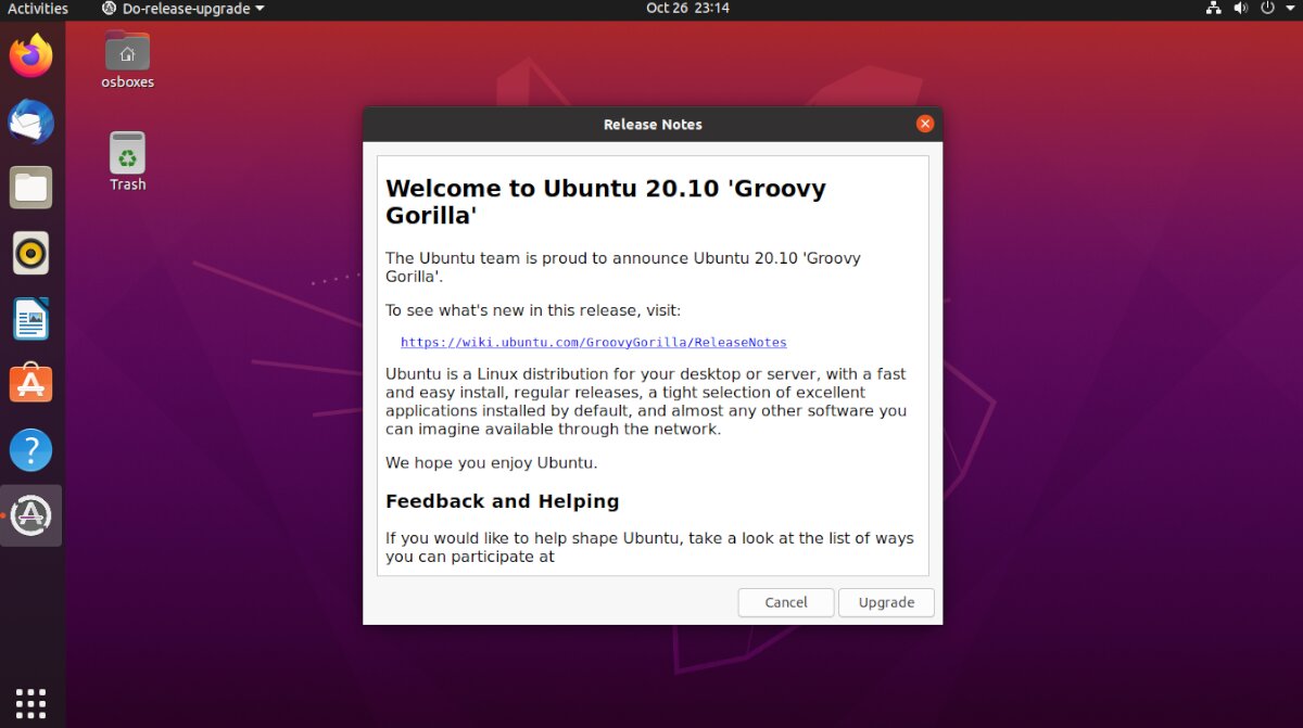 Upon logging back into your Ubuntu PC after the reboot, you will be using Ubuntu 20.10 Groovy Gorilla! Enjoy!