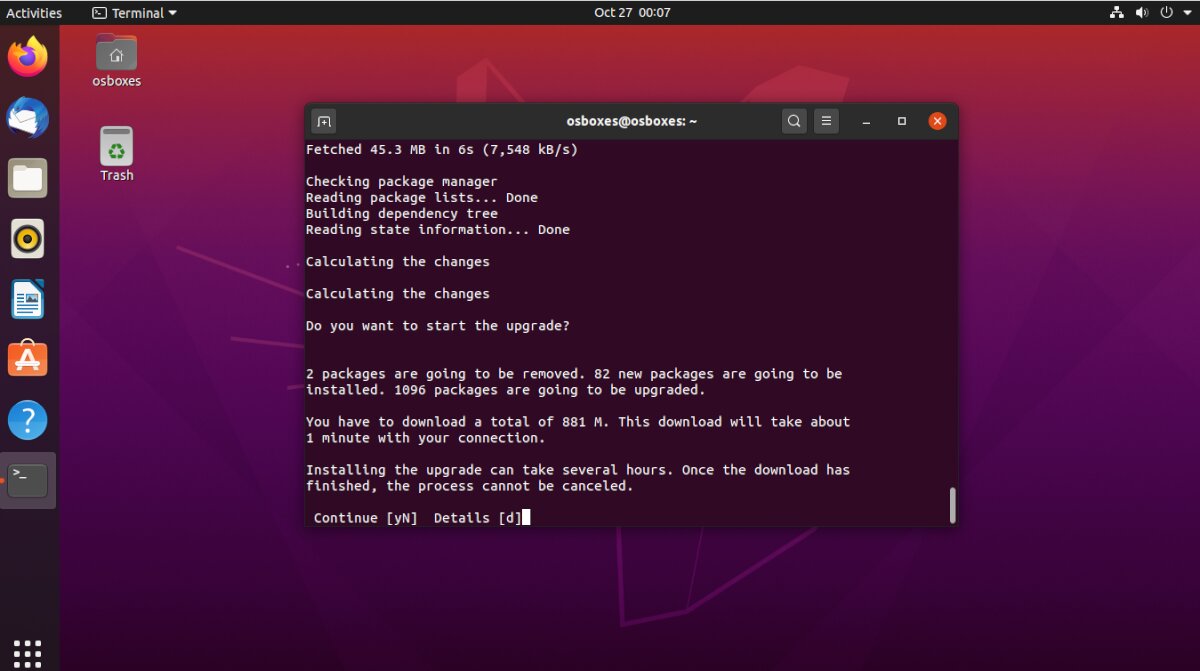 Read the prompt in the terminal. When you’ve finished reading it, press the Y button to download all of the Ubuntu 20.10 packages to your system. Keep in mind that this download could take a long time, especially if you have slow internet.