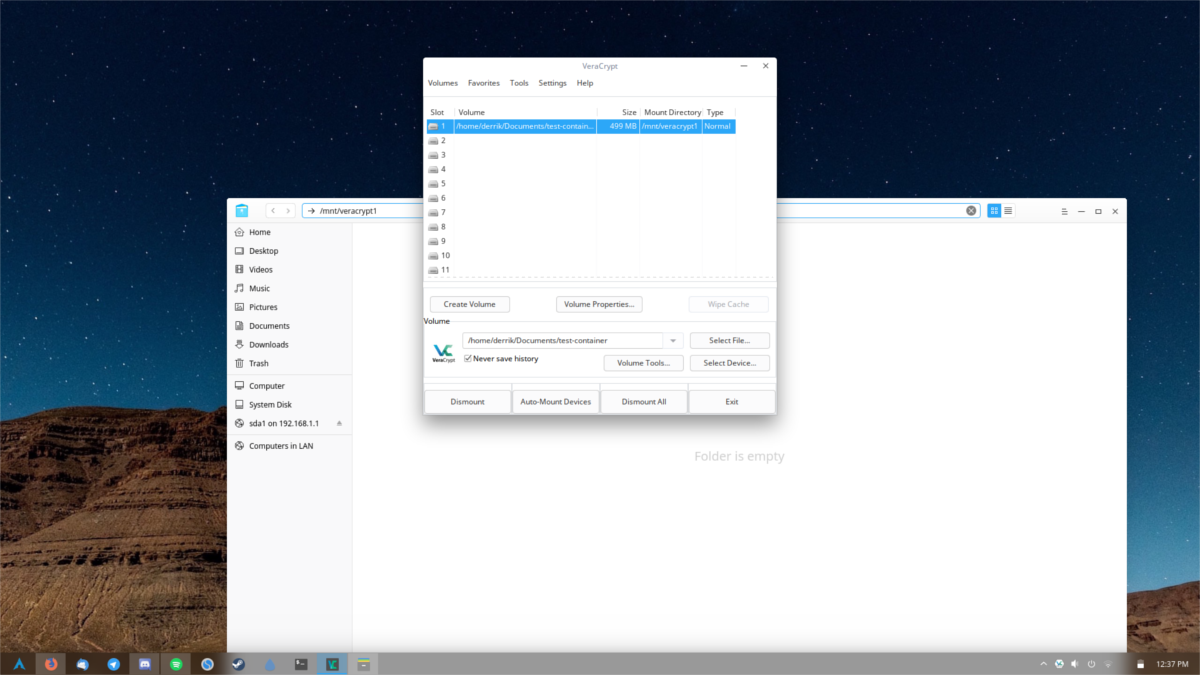 When the volume is mounted, you’ll be able to add as much data as you want to it. To access it, go to the VeraCrypt tool, and select the volume from one of the slots in the list. Click “open” to launch the container in your file manager. From here, place as many files inside as you’d like. When done, go back to the software and select “dismount”.