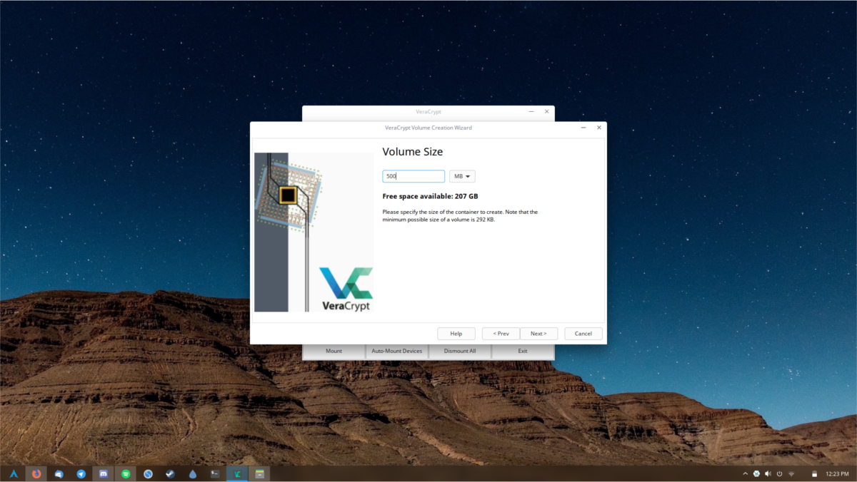 The next step in the volume creation process requires selecting an encryption algorithm. The default option is a good choice (AES), but if you’d like something different, click the drop-down menu to choose other methods of encryption, and then click next to move on to choosing the size of your container.