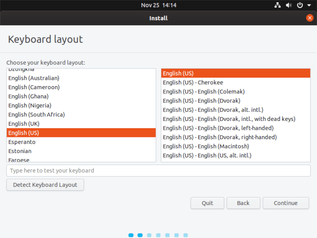 After selecting the “Install Ubuntu” button, you will be presented with the “Keyboard layout” page. Look through this page for your keyboard layout (if Ubuntu hasn’t automatically detected it.) Then, click the “Continue” button to apply your layout choice.