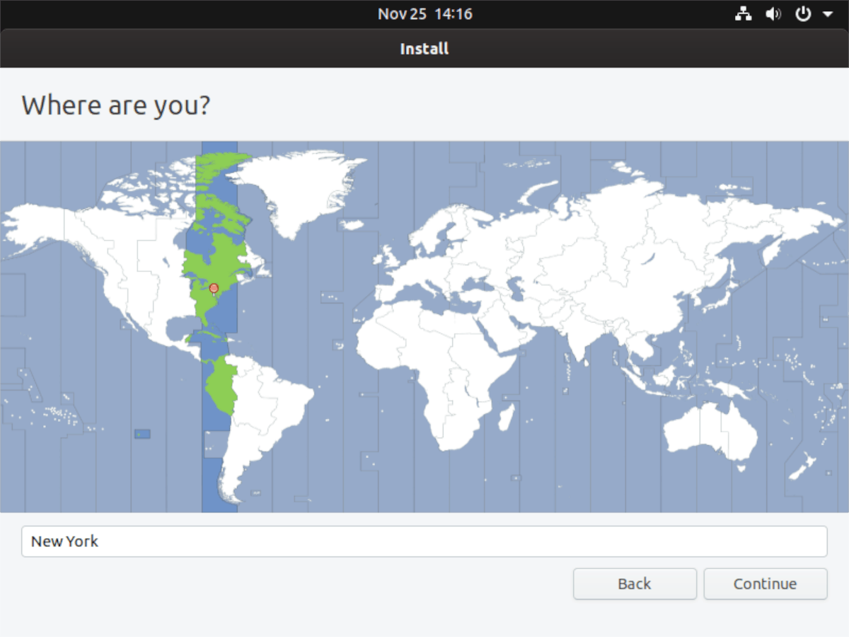 After the “Installation Type,” is the “Where are you” page. Here, Ubuntu asks where you are in the world, so it can determine the time-zone you live in. Using the mouse, click on the map in the timezone near where you live. Alternatively, type out a timezone in the text box. When your timezone is set, click the “Continue” button to move to the next page.