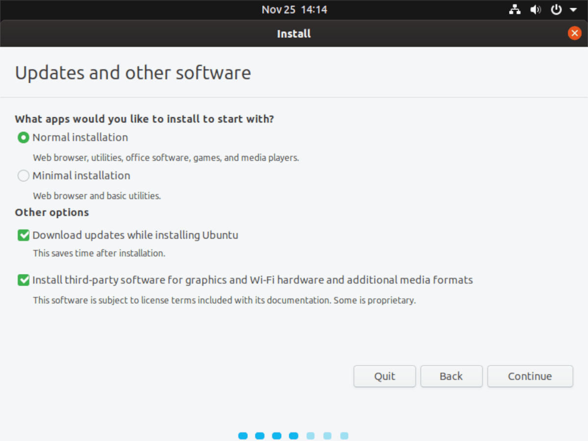 On the next page, after “Keyboard layout,” you will see the “Updates and other software” page. Here Ubuntu asks you, “What apps you would like to install to start with,” and “other options.”