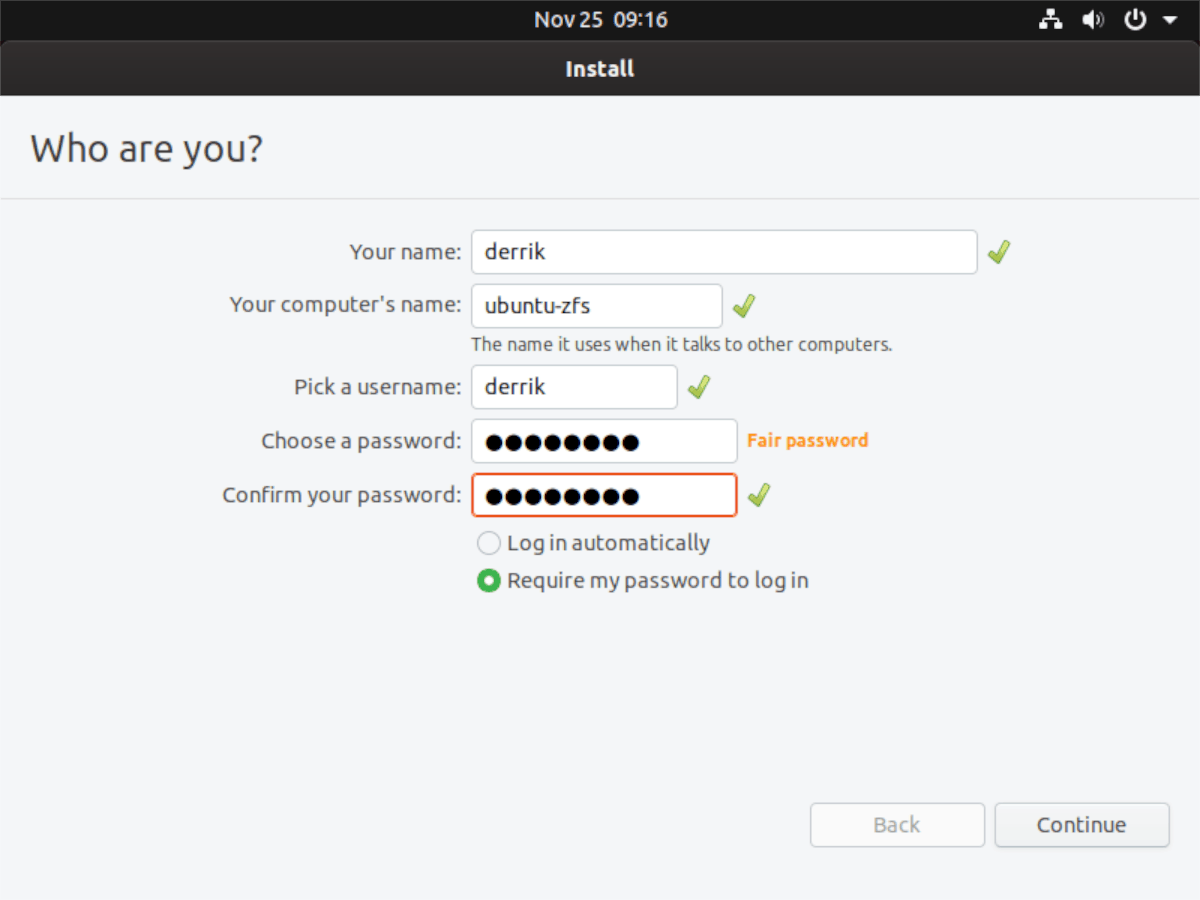 With your name, computer name, username, and password set up, Ubuntu will finish up the installation process. When the installation process is complete, reboot Ubuntu to use your new Ubuntu ZFS installation!