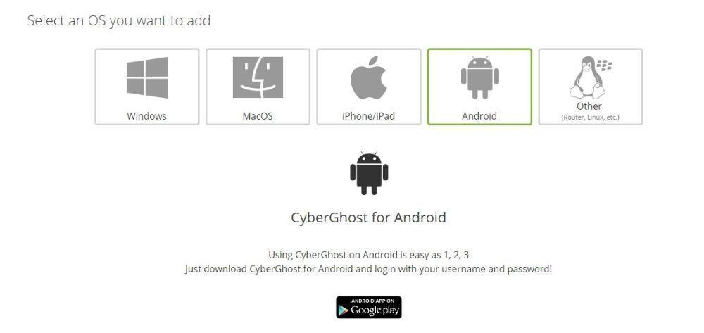 Note: You can also install CyberGhost directly from the Android marketplace without visiting it through CyberGhost’s accounts menu. Make sure you install the official app from Cyberghost SA and not a copycat program, which could harm your device.