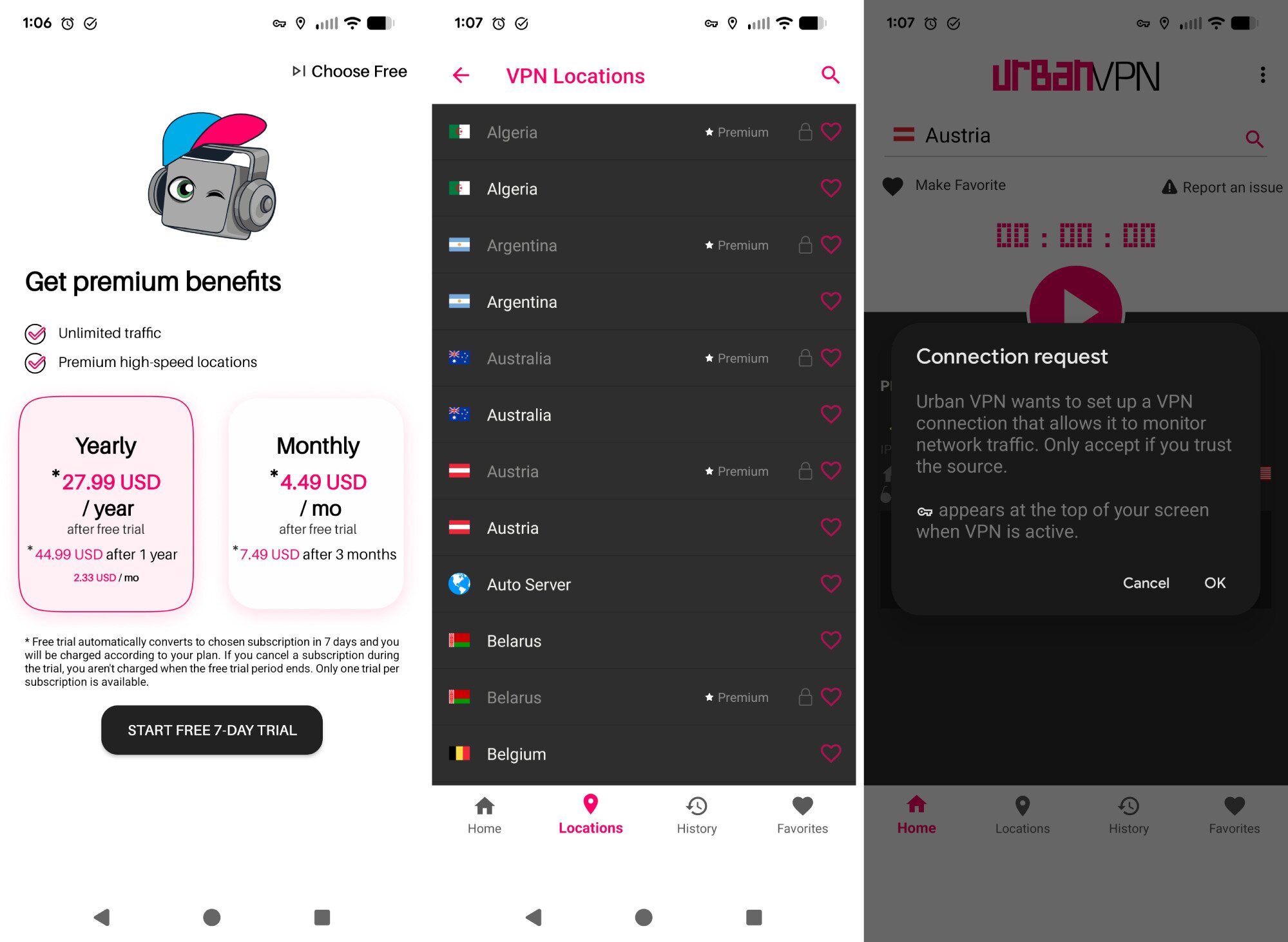 The mobile apps work a bit differently. On Android and iOS, Urban VPN offers an optional Premium subscription that adds more server locations and supports multiple devices under one plan. Pricing varies by how long you subscribe, with the lowest rate reaching just above $2 per month if you commit to two years upfront, while a standard month-to-month option costs $9.56. The paid tier is primarily meant for people who want more reliable performance or access to the full list of premium servers.