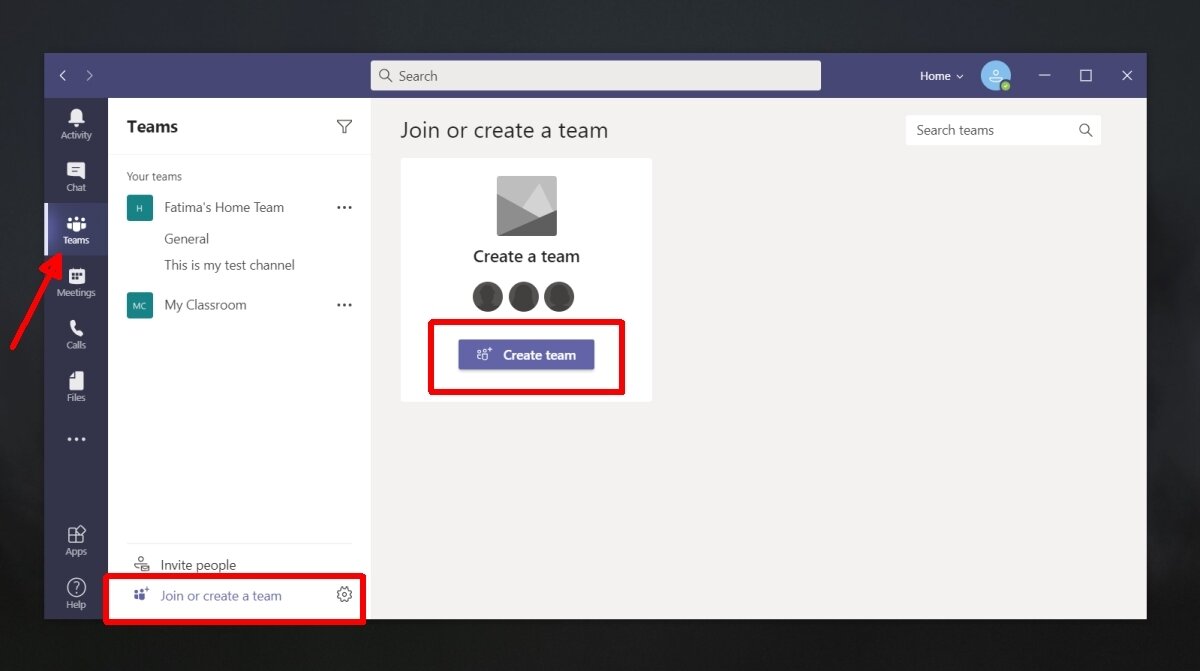 - Click the ‘Join or create team’ button at the bottom of the Teams column.