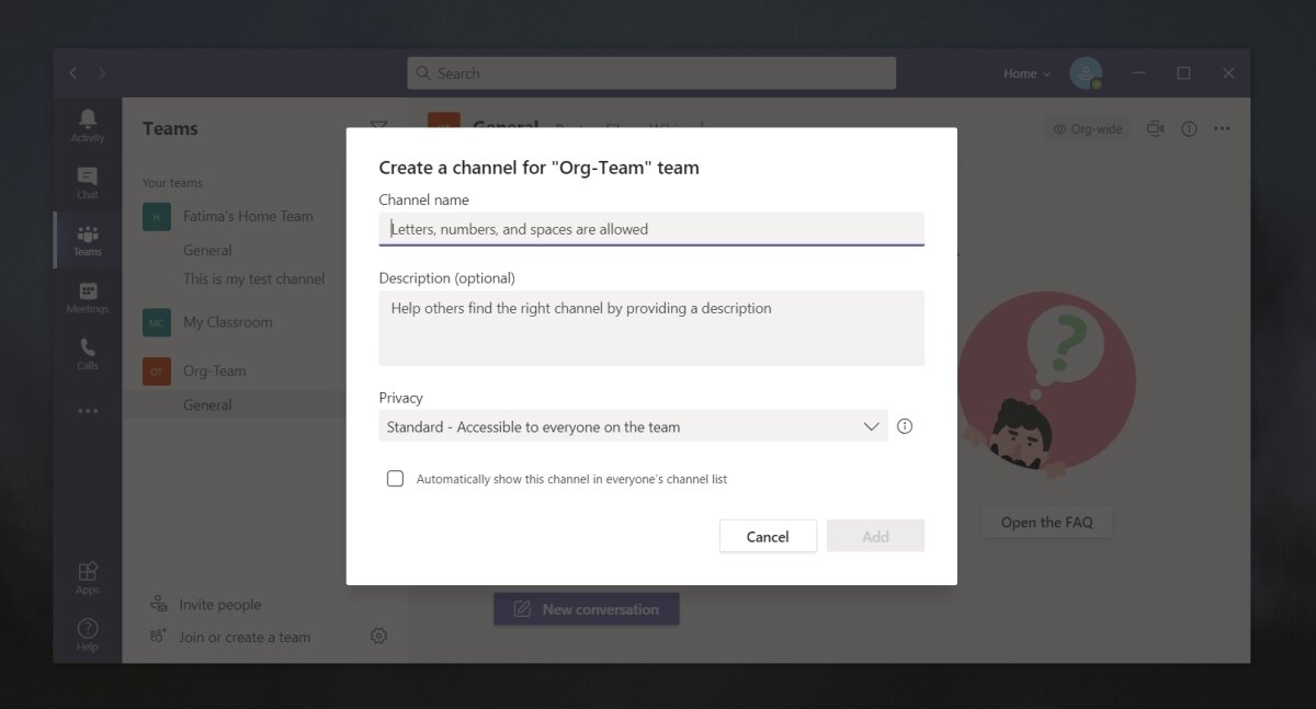 To add a new channel to a team from the Microsoft Teams admin center, follow these steps.