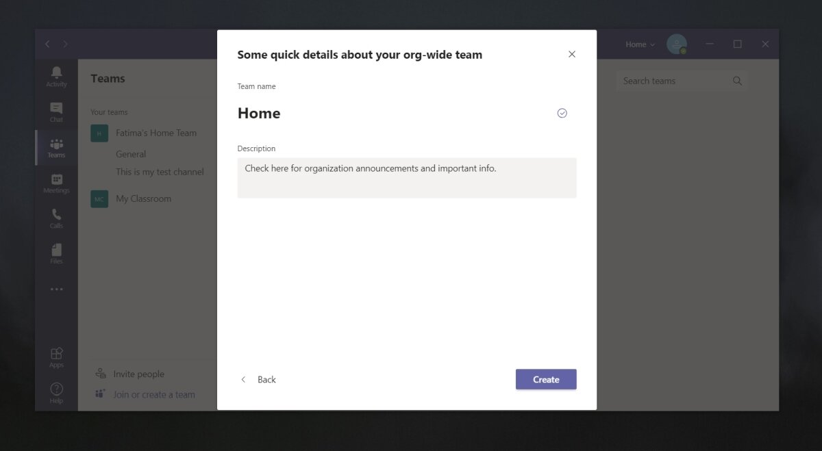 - Give your team a name, and click Create. You can enter a description of the team if you want.