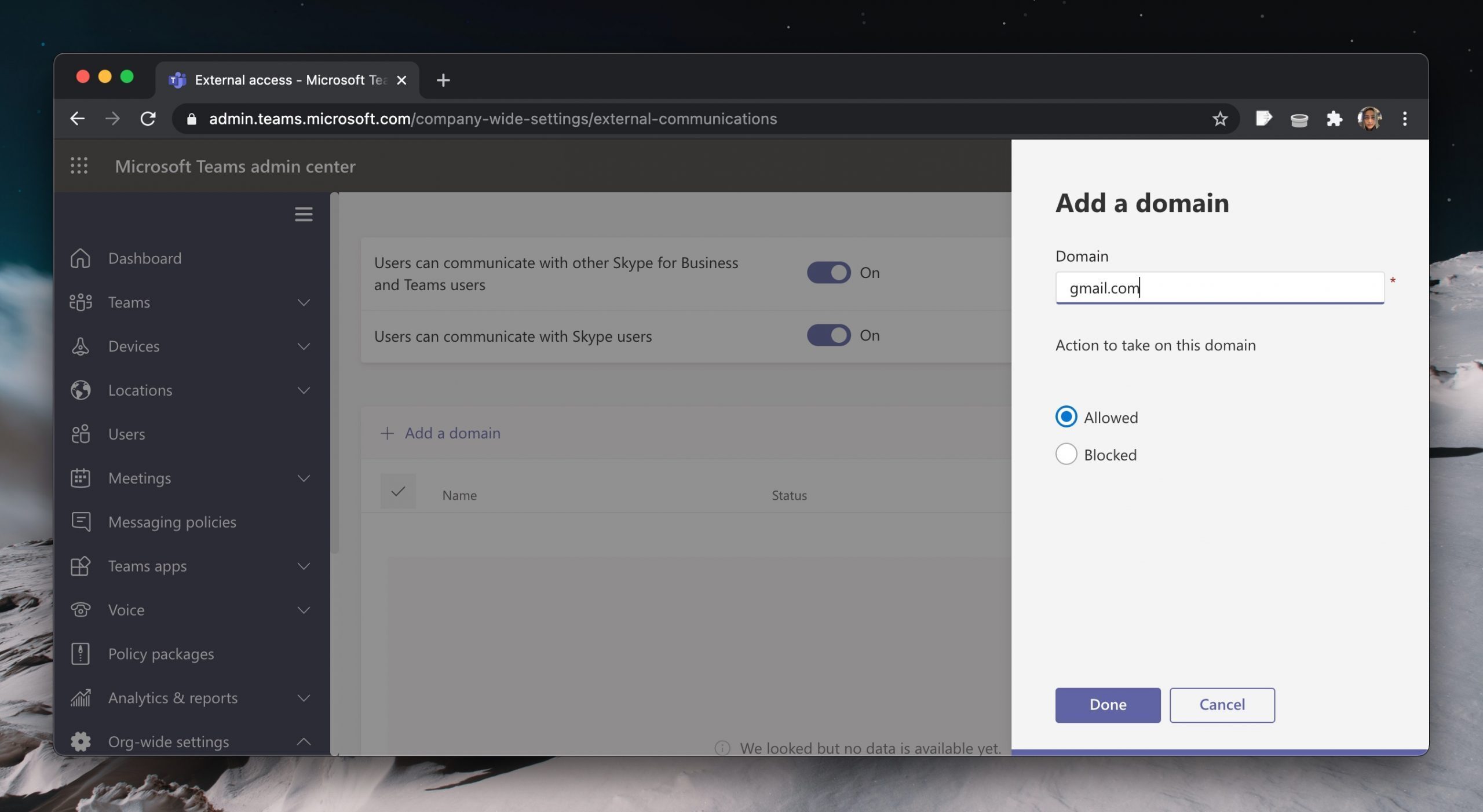 We will be adding ‘gmail.com’ which allows us to add anyone who has a Gmail email as an external user to Microsoft Teams.