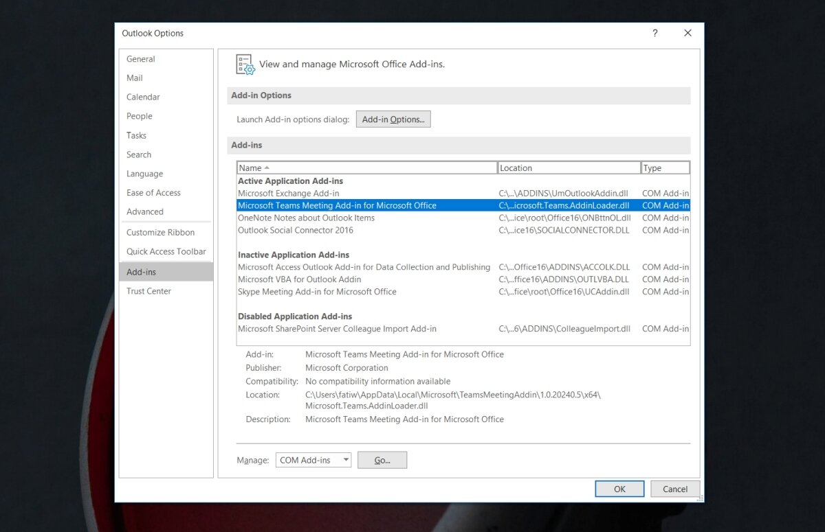 - Go through the list of add-ins and you should see one named Microsoft Teams Meetings.