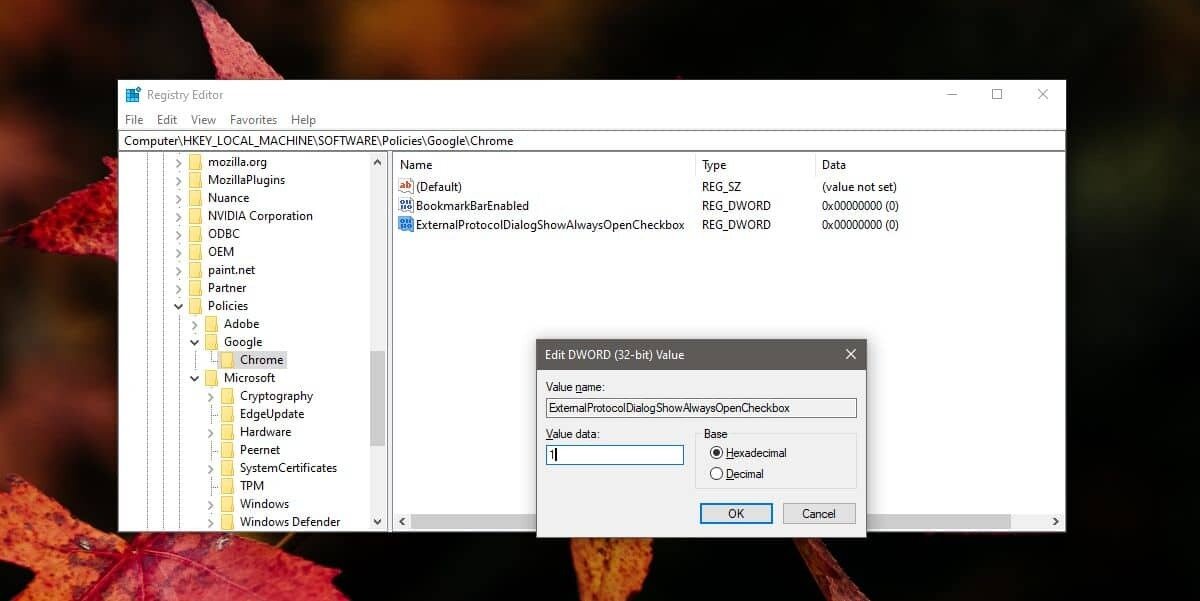Once you have the keys set up, you need to right-click the Chrome key and select New>DWORD (32-bit) Value from the context menu. Name this value ExternalProtocolDialogShowAlwaysOpenCheckbox, and set its value to 1.