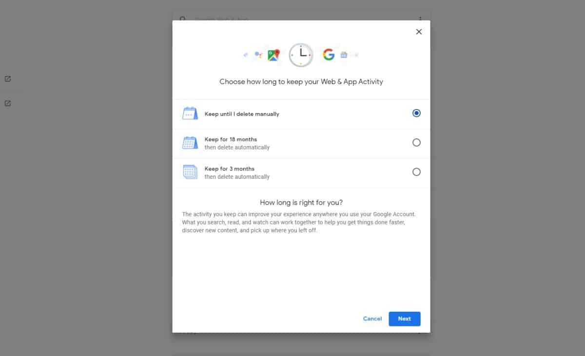 You will see a pop up that gives you two options for automatically deleting your data. The options are for deleting data after 18 months, and after 3 months. Those are the only two options there are. Select one to automatically delete Google data.