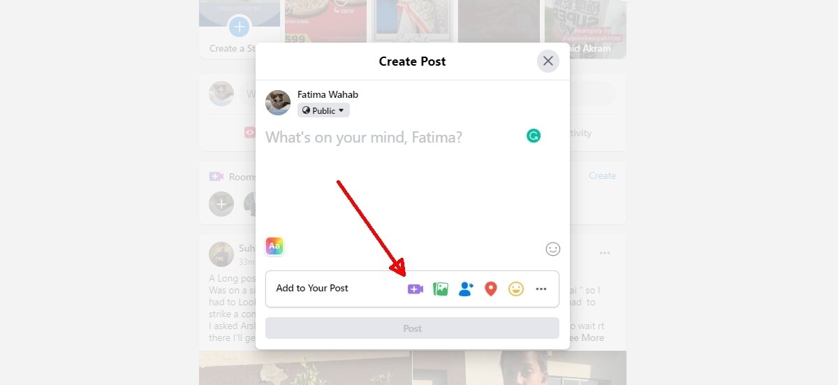- Click the purple webcam icon (you might see a ‘Rooms’ section just below the new post box with a ‘Create’ button at the top right corner. You can click it to create a room).