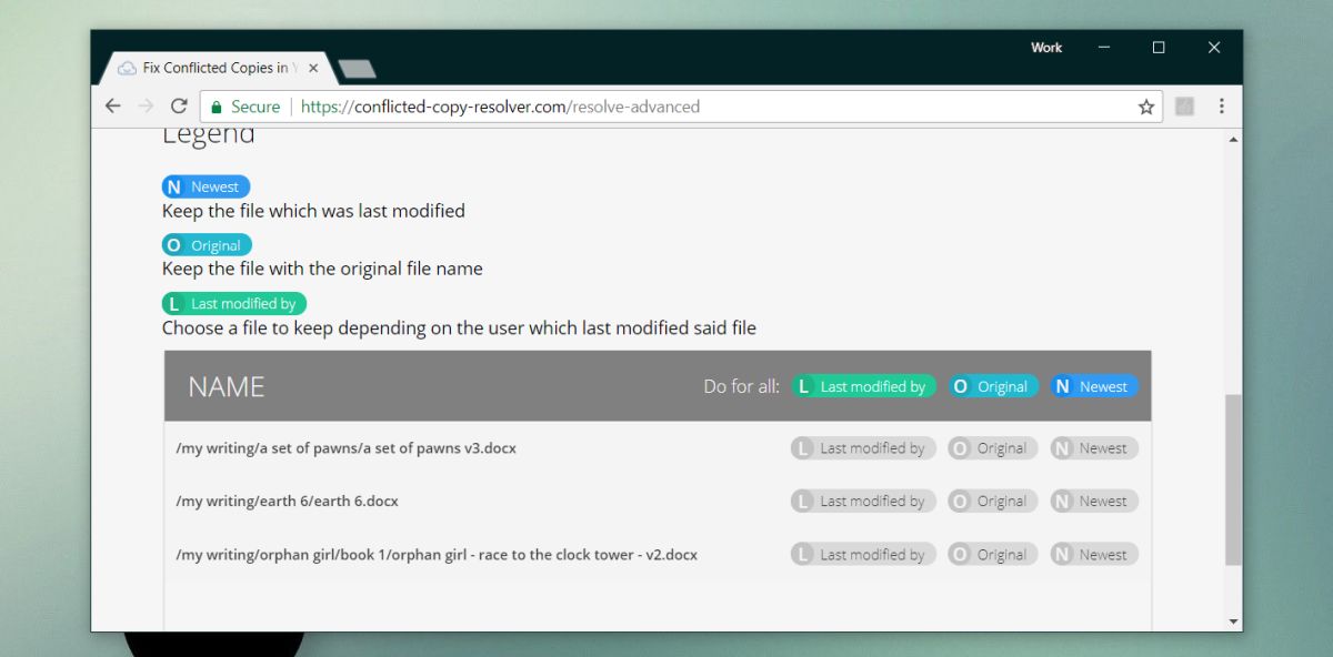 Once you’re signed in and you allow the app to access files in your account, Conflicted Copy Resolver scans it for conflicted files. If it finds conflicted copies, it gives you three options to deal with them.
