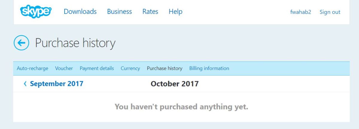 The purchase history page shows you all your Skype activity on a per-month basis. It includes information about calls and messages (SMS) that you’ve sent via your Skype account and what rate they were charged including the total cost. It updates as you make calls and/or send messages so you can check the cost of a Skype call anytime.
