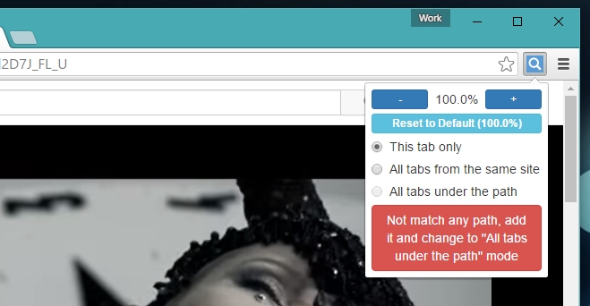 The ‘All tabs under the path’ option will automatically zoom in all pages from a particular domain that you’ve set in the extension’s option. To set the domain, go to the extension’s settings. In the ‘Per-path’ tab, enter the URL you want to zoom into and set the zoom level. To automate this, i.e., make it so you don’t have open the extension’s UI to set zoom, go to the ‘Basic Setting’ tab and set default zoom mode to ‘Zoom tab according to per-path basis’.