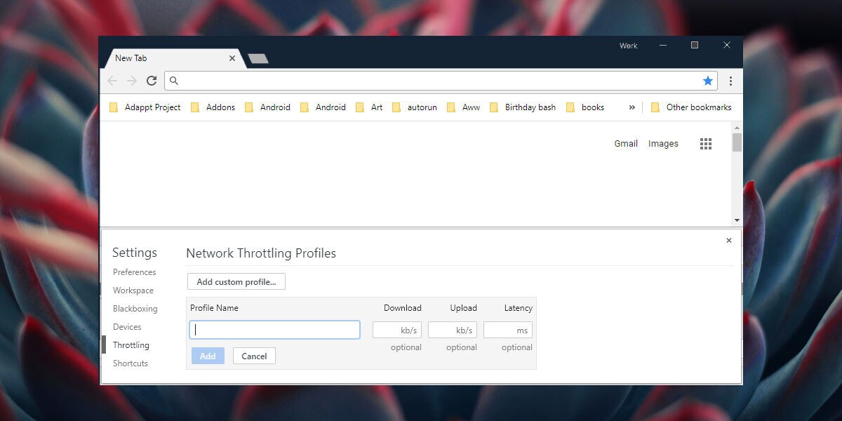Give your custom profile a name, and enter the maximum download and upload speed you want to allow the current Chrome tab to have. You can leave the Upload and Latency fields blank and just enter a download speed in kb/s. Click Add.