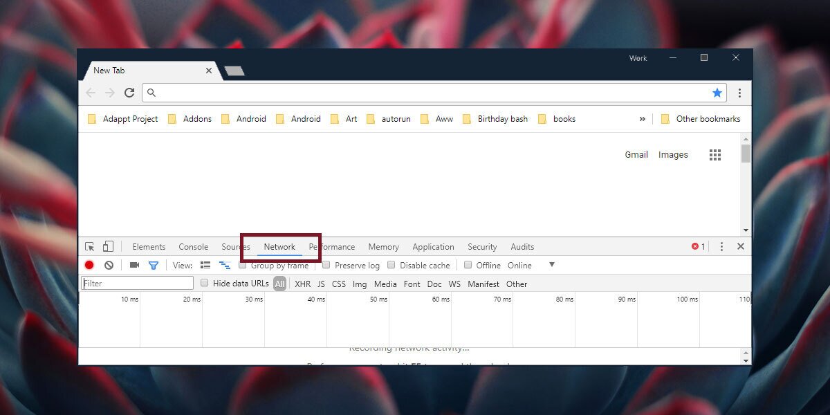 Open a new tab in Chrome and tap the F12 key. This will open the web development tools. Select the Network tab.