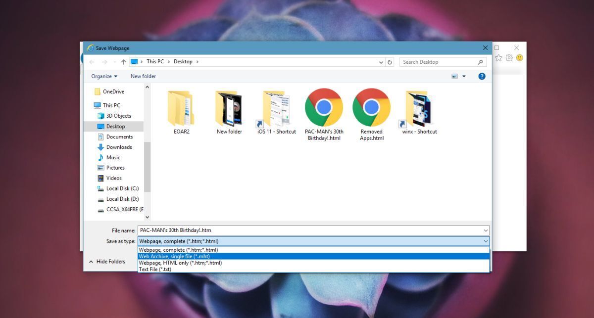In the Save as dialog, open the Save as type dropdown and select the Web archive format, and save the doodle. It will be saved with the MHT extension. This file type can only be opened in Internet Explorer. Open it, and you will be able to play the doodle.