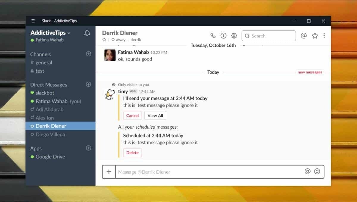 Slack is one the best messaging apps targeting work places. Most people know it as the fun messaging app where you can send GIFs but it’s actually really great at finding and retrieving links and images that have been shared over various channels. There’s also the fact that it’s highly customizeable with the right Slack app. If you need to schedule messages on Slack, you can do so with a free app called Timy.