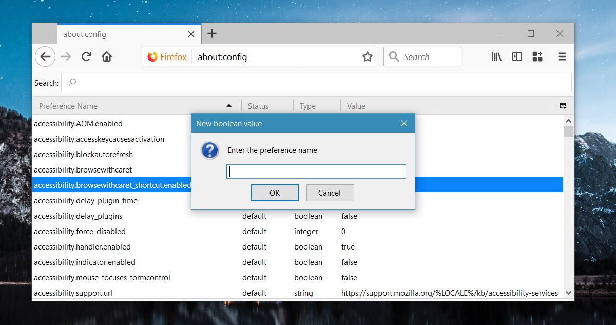 First, open the about:config page. Accept the warning twhen you’re prompted. Note down the preference that you want to sync i.e. right-click it and select Copy name from the context menu.