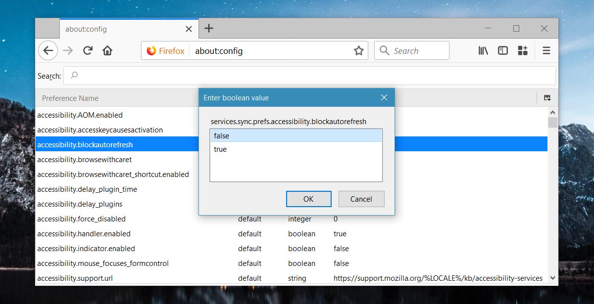 Replace ‘setting’ with the name of the preference you copied earlier. For example, if you want to sync the accessibility.blockautorefresh preference, you should name the new boolean preference as follows;