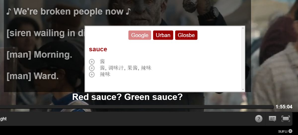 Once you’ve selected a language, start your Netflix binge. Whenever a word appears on the screen that you want to translate to the language you selected, click it. A pop-up will open showing you a Google Translate look-up of the word. In addition to using Google Translate, you can also look the word up on Urban dictionary, and on Glosbe.