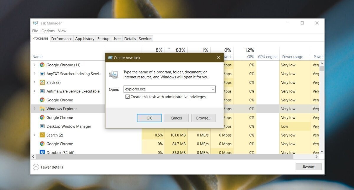 - In the run box, enter explorer.exe and enable the Create this task with administrative privileges option.
