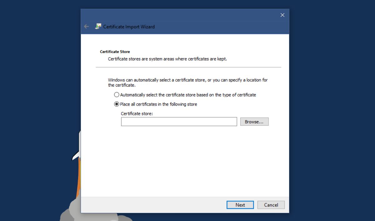 Select ‘Place all certificates in the following store’, and click Browse.