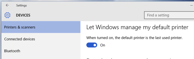 Open the Settings app and go to the Devices group of settings and select the Printers & Scanners tab. Scroll down and enable the ‘let Windows manage my default printer’ option.