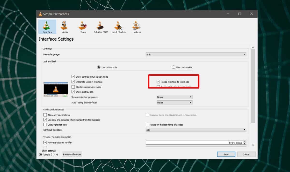 On the preferences window, go to the Interface tab, and look for an option called ‘Resize interface to video size’. Enable it, and click the Save button at the bottom.