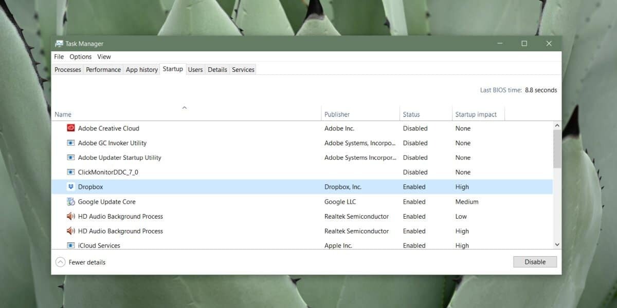 A startup item can often be the cause of a problem. It may not appear immediately i.e., you may only experience the problem a few minutes after you’ve booted to your desktop. This is because Windows 10 doesn’t start everything up at once. It does so sequentially so that the system isn’t immediately overburdened with all the processes, system or otherwise, that need to start.