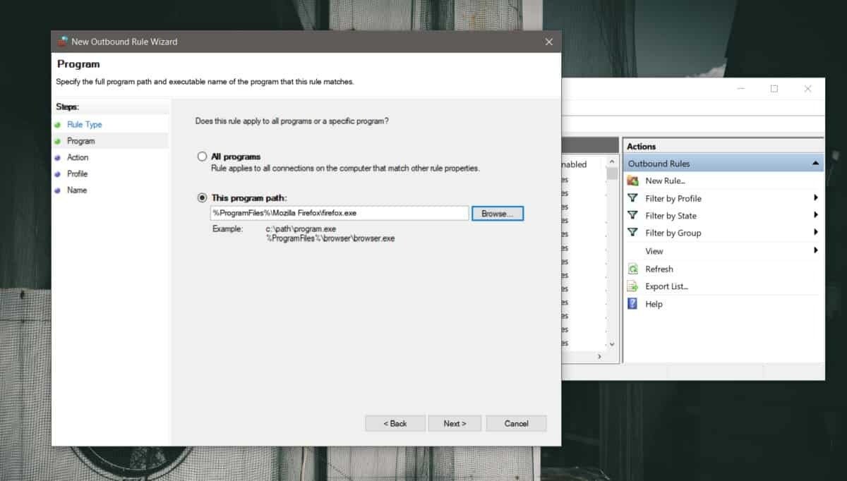 In the Window that opens, select Program and click Next. On the next screen, select This Program Path, and click the browse button. Select the EXE of the app that you want to block network access to.