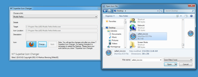 W7 Superbar Icon Changer is a portable tool that can change the icon of the applications added to the Windows 7 Superbar (Taskbar). For instance, if you don’t like the default Internet Explorer or Firefox icon because it doesn’t match the theme, then you can change this icon on your Superbar.